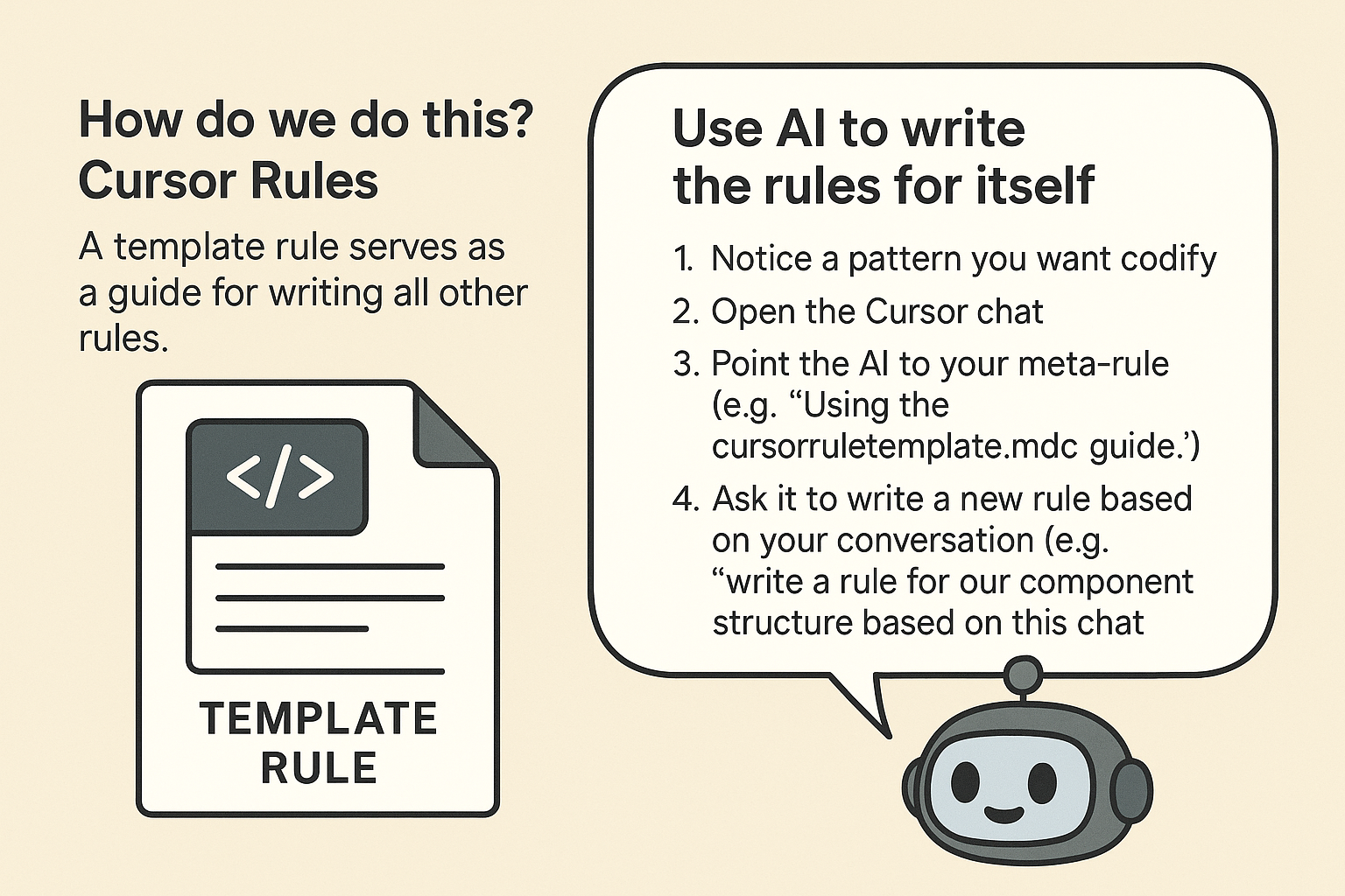 - During a long coding session: After spending hours working with the AI on a specific pattern or convention, I realized, "I don't want to explain this again next time." I simply tell the AI: "Based on everything we've discussed so far and following the meta-cursor rule pattern, please create a rule for this approach and name it appropriately." The AI drafts it, and I save it for future use.