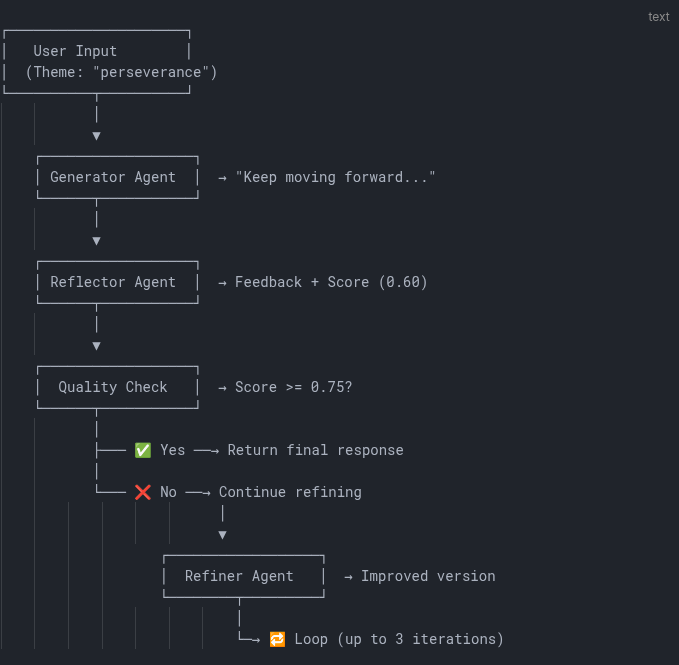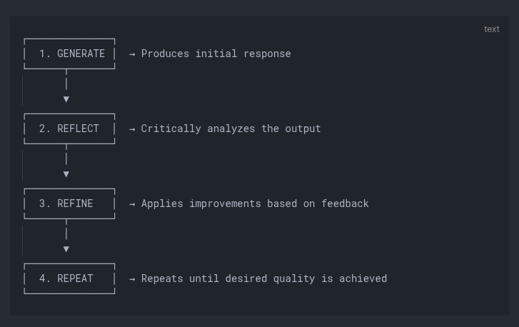 This pattern is inspired by self-reflection and self-correction techniques used in advanced AI systems, where the model not only generates content but also evaluates and continuously improves it.